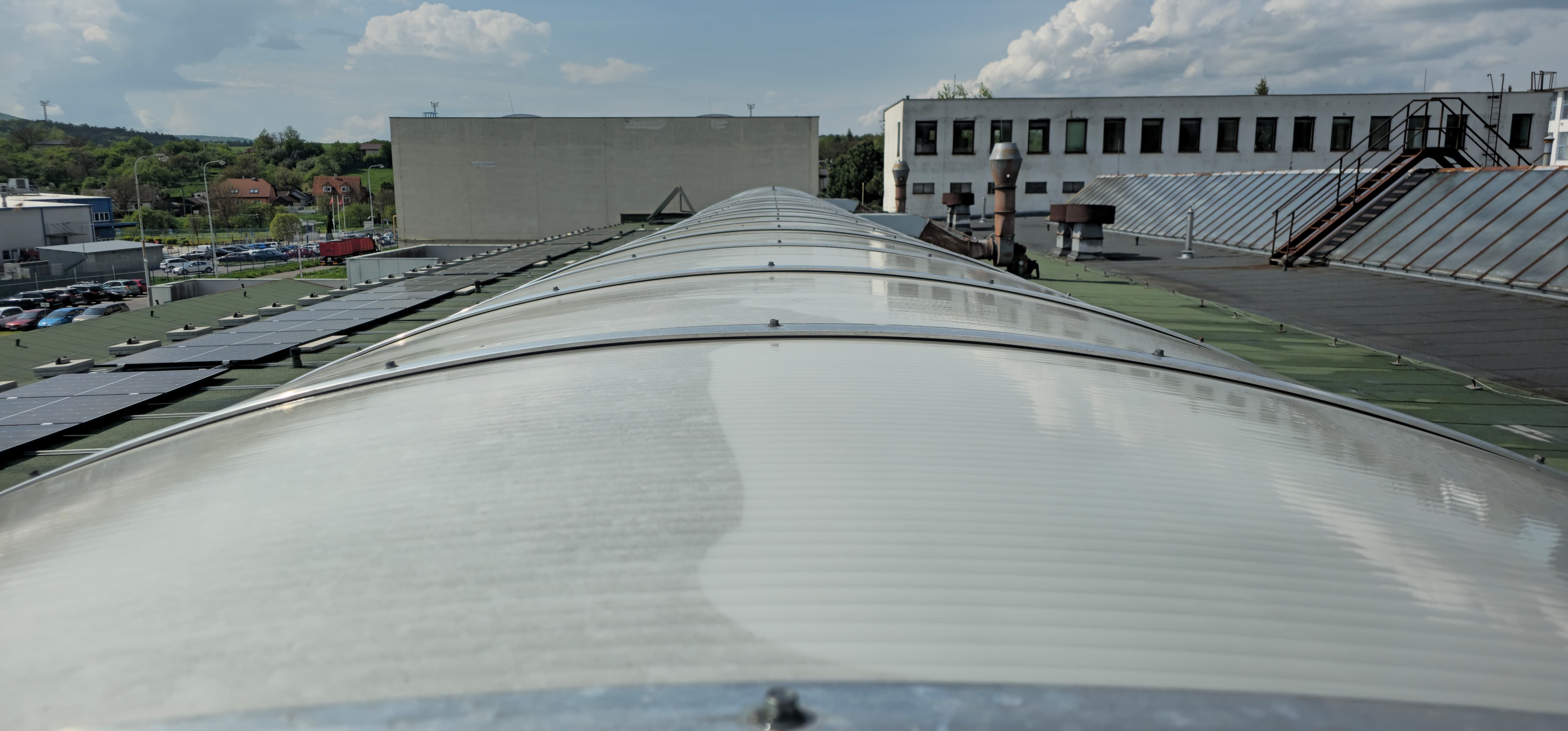 Odborné čištění střešních světlíků na průmyslovém objektu, které zajišťuje maximální prostup světla, dlouhou životnost a bezproblémovou funkčnost světlíků.